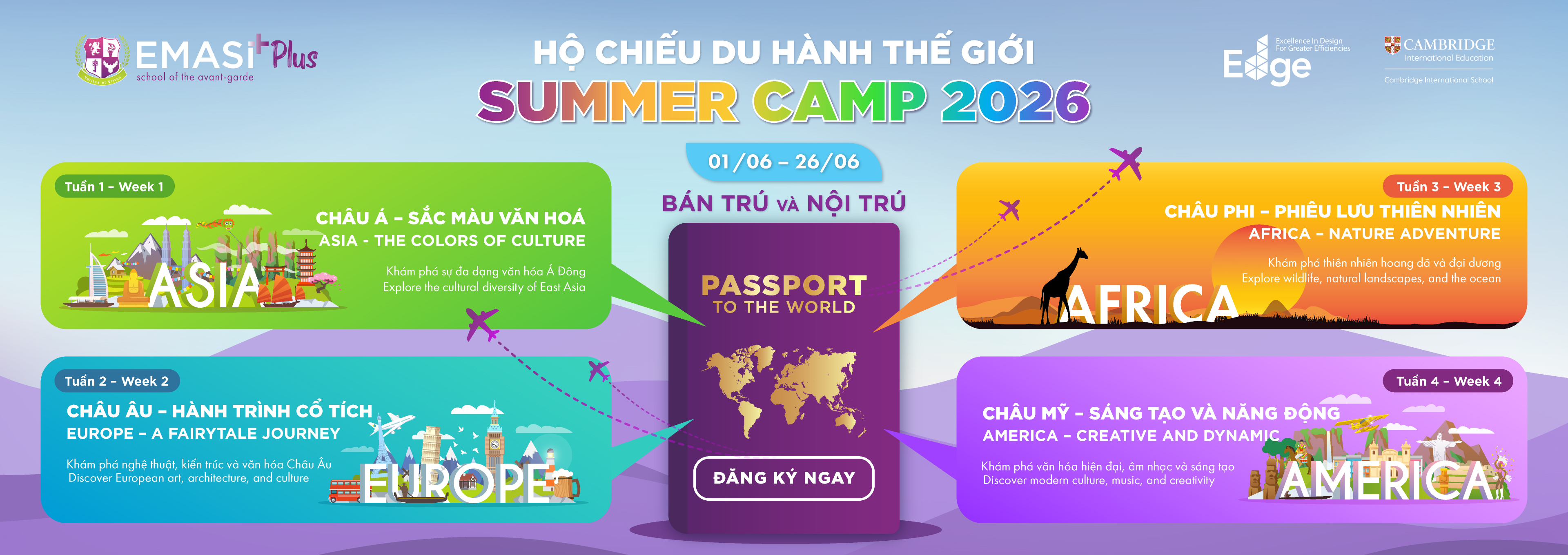 Summer 2026 tại EMASI Plus là mùa hè của hành động, khám phá và trưởng thành. Học sinh được học qua trải nghiệm thực tế, vui chơi qua những thử thách đầy năng lượng trong thể thao, nghệ thuật, âm nhạc và các hoạt động sáng tạo. Mỗi ngày hè là một cơ hội để các em mở rộng hiểu biết, kết nối bạn bè, rèn luyện kỹ năng và tự tin bước ra khỏi vùng an toàn, tạo nên một mùa hè ý nghĩa và đáng nhớ.